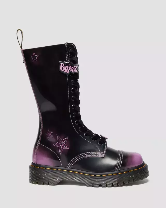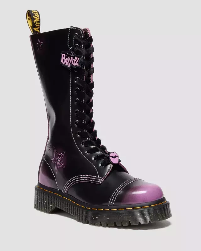 Mostre sua ousadia com as botas Bratz 1B99, uma edição limitada e arrojada. Estas botas de cano alto possuem 14 olhos, puxador no calcanhar e nossa costura amarela exclusiva. Combinando couro roxo Arcadia com costura lilás contrastante, as botas Bratz 1B99 têm detalhes de estrelas em relevo, cadarços planos de veludo, um detalhe de amarração em formato de lábio e um emblema Bratz de inspiração militar. Elas também possuem um solado Bex robusto e brilhante. Um par extra de cadarços lilás está incluído.